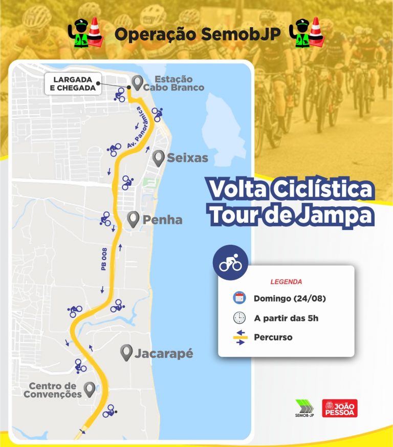 Já a Volta Ciclística Tour de Jampa será realizada no domingo (24), a partir das 5h, com largada e chegada na Estação Cabo Branco – Ciência, Cultura e Artes, no Altiplano. Os ciclistas percorrerão a Avenida Panorâmica e a rodovia PB-008, seguindo até o Centro de Convenções de João Pessoa, de onde retornam pela mesma rota até o ponto final na Estação Cabo Branco.