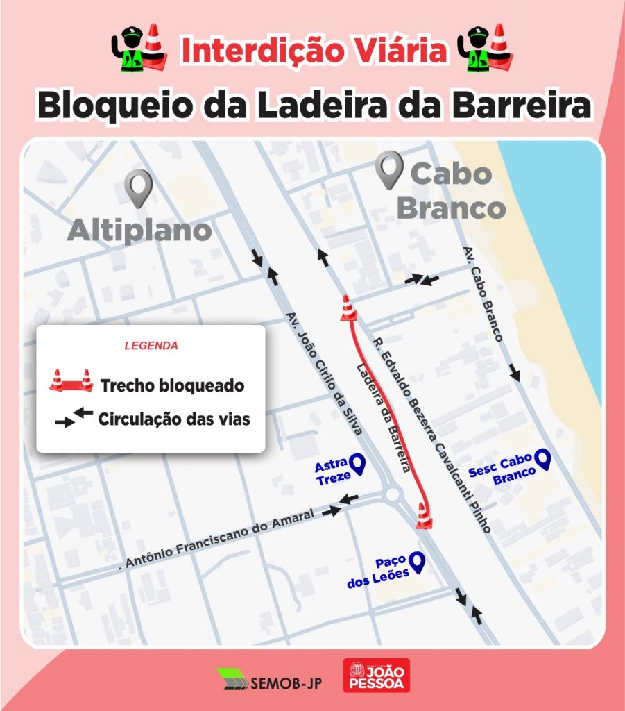 A Prefeitura de João Pessoa, por meio da Superintendência Executiva de Mobilidade Urbana (Semob-JP), anunciou a interdição total da ladeira que liga os bairros Altiplano e Cabo Branco, no sentido bairro/orla. A medida, válida desde a última segunda-feira (1º), afeta pedestres, ciclistas e motoristas e foi adotada por motivos de segurança, já que o trecho está sob análise técnica.