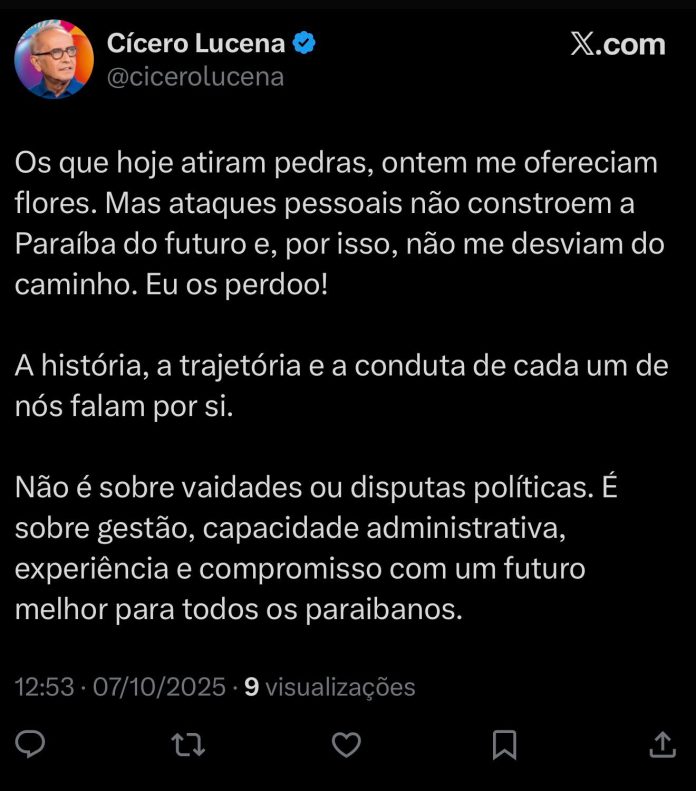 “Os que hoje atiram pedras, ontem me ofereciam flores. Mas ataques pessoais não constroem a Paraíba do futuro e, por isso, não me desviam do caminho. Eu os perdoo”, escreveu Cícero, acrescentando que sua gestão “não se baseia em vaidades ou disputas políticas”.