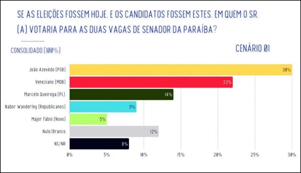 Em segundo lugar aparece o senador Veneziano Vital do Rêgo (MDB), com 22%. O ex-ministro da Saúde e presidente estadual do PL, Marcelo Queiroga, soma 14%, seguido pelo prefeito de Patos, Nabor Wanderley (Republicanos), com 9%. O ex-deputado federal Major Fábio (Novo) aparece com 5%.