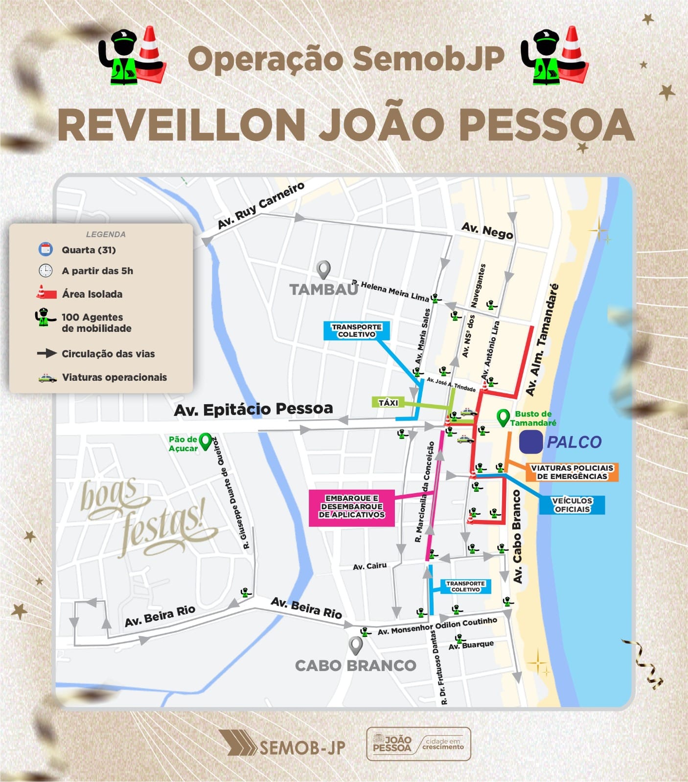 Para garantir a segurança viária e facilitar o deslocamento do público durante as comemorações de Réveillon em João Pessoa, a Superintendência Executiva de Mobilidade Urbana de João Pessoa (Semob-JP) preparou uma operação especial de trânsito e transporte para esta quarta-feira (31) e quinta-feira (1º de janeiro).