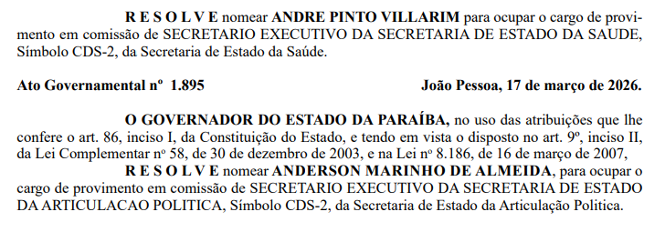 O governador da Paraíba, João Azevêdo, oficializou a nomeação de novos secretários executivos para as pastas de Articulação Política e de Saúde. As designações foram publicadas na edição desta quarta-feira (18) do Diário Oficial do Estado.